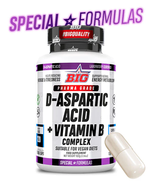 D-Aspartic Acid + Vitamin B es un complejo aminoácido + multivitamínico exclusivo de Big® destinado a mejorar la práctica deportiva, aumentando el nivel de testosterona de manera natural y mejorando el rendimiento en general.