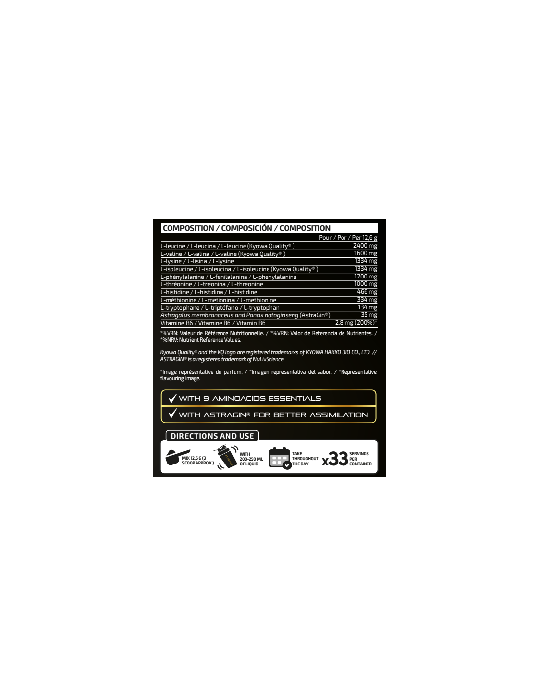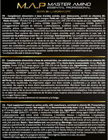 MAP Luxury® es un complemento alimenticio con aminoácidos esenciales de origen vegetal (calidad Kyowa Quality®) y vitamina B6. Fórmula sin azúcares añadidos*, apta para veganos y pensada para tomarse antes, durante o después del entrenamiento.